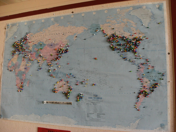 在牆上的世界地圖釘滿了小小的圖釘~不用說台灣已經被擠爆了